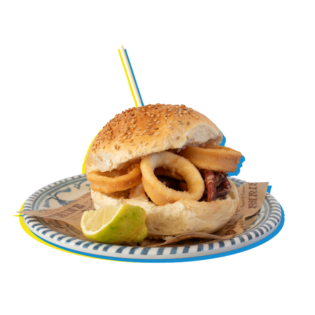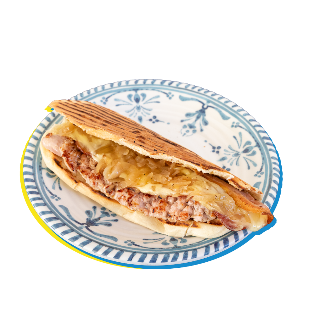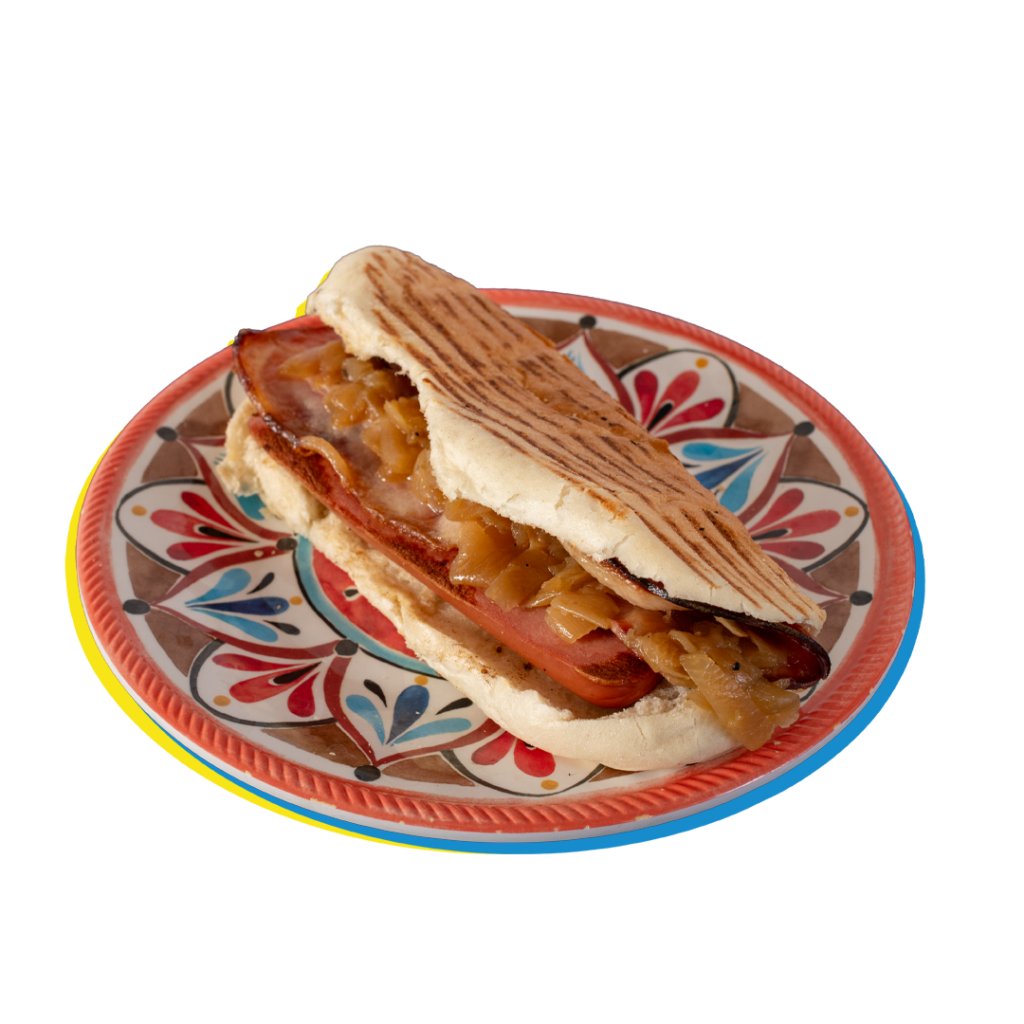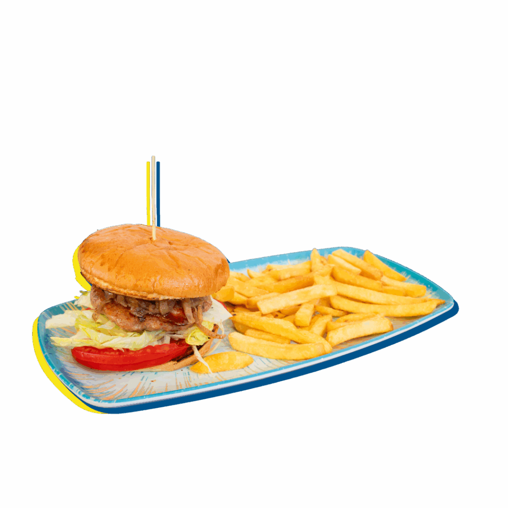 Bun Artigianale, Hamburger da 150g, lattuga, cipolla cotta, bacon, pomodoro