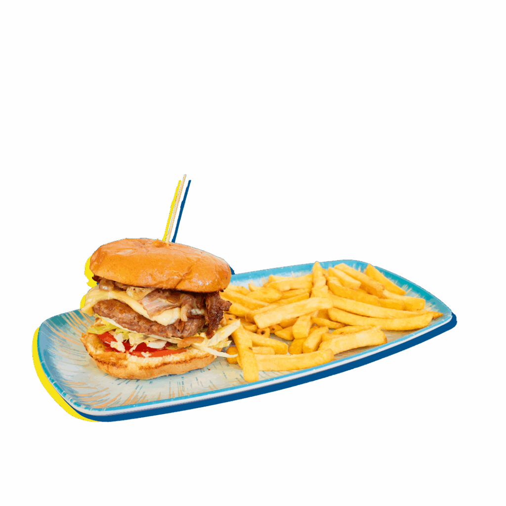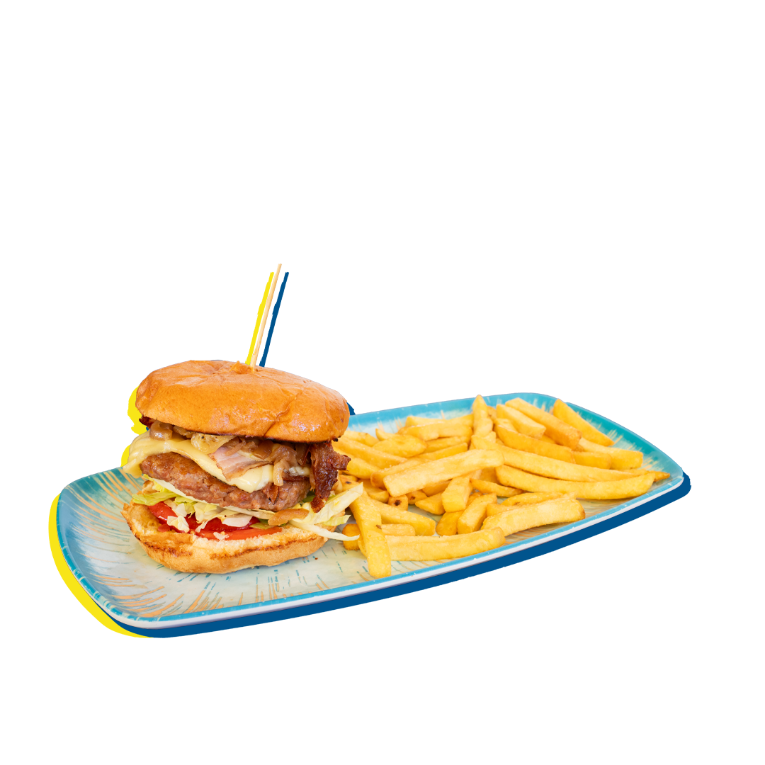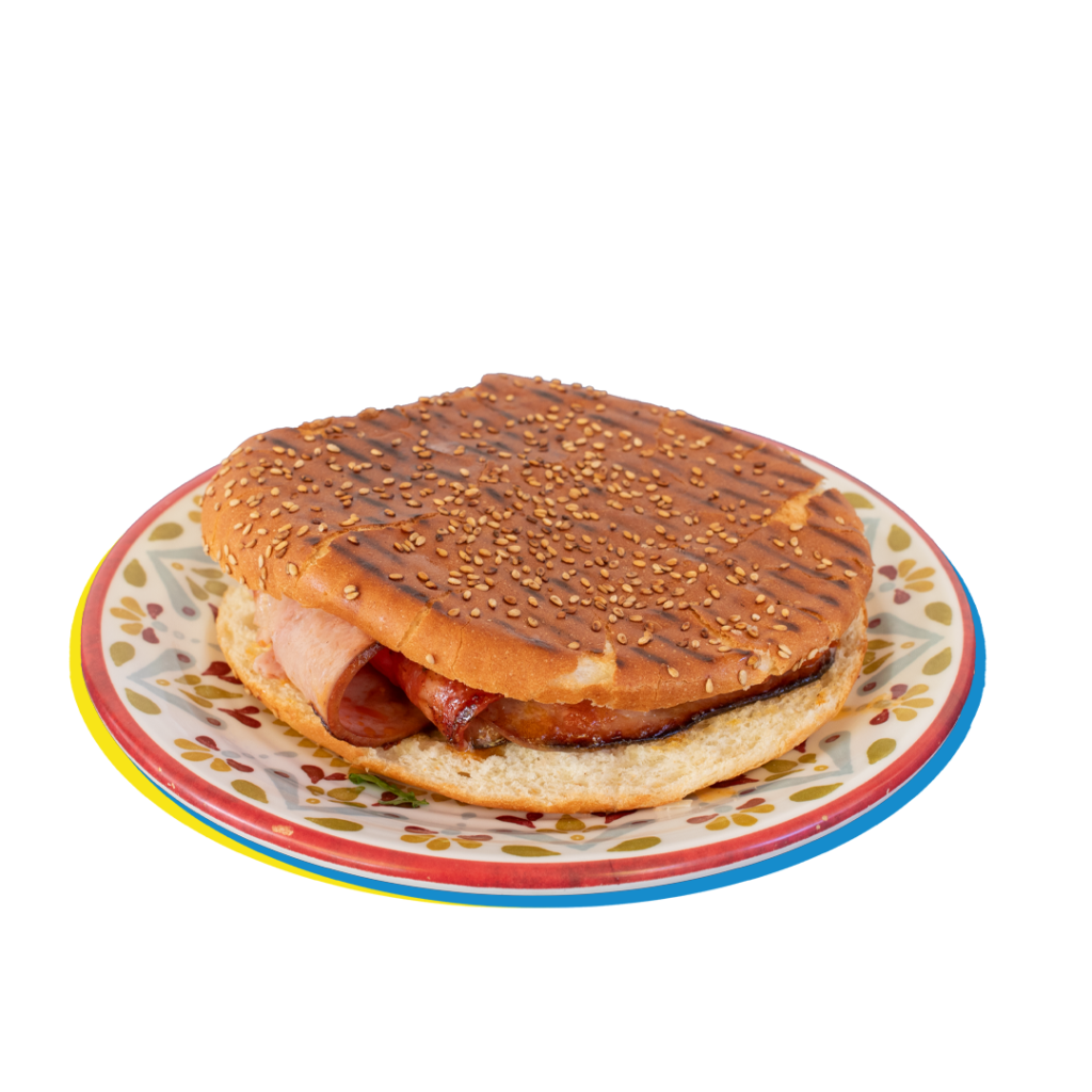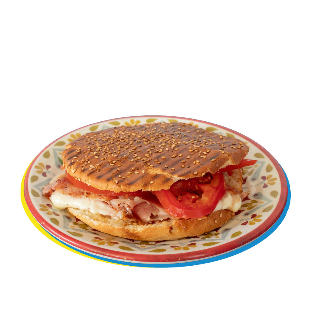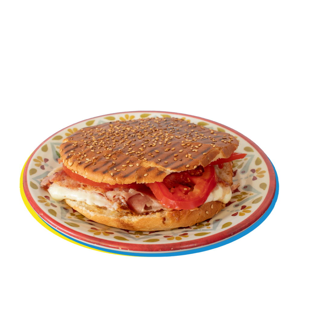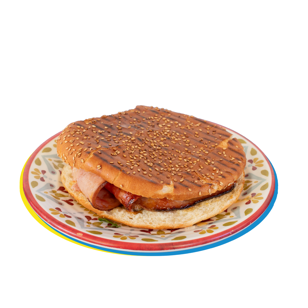 Bun Artigianale, Hamburger da 150g, lattuga, cipolla cotta, bacon, pomodoro
