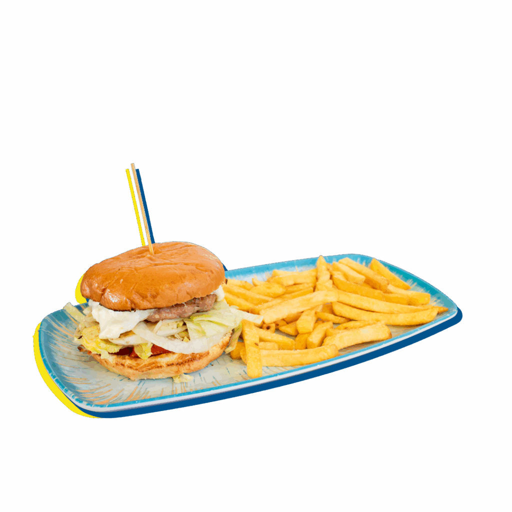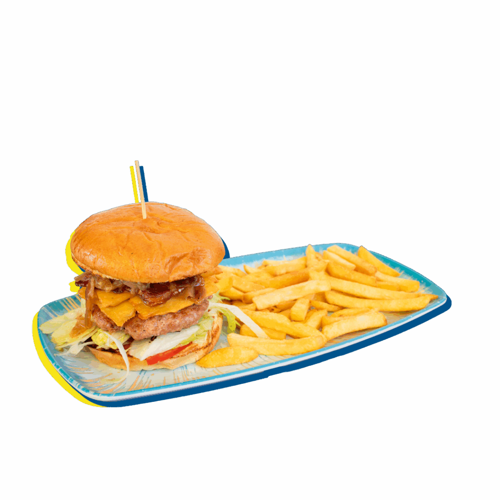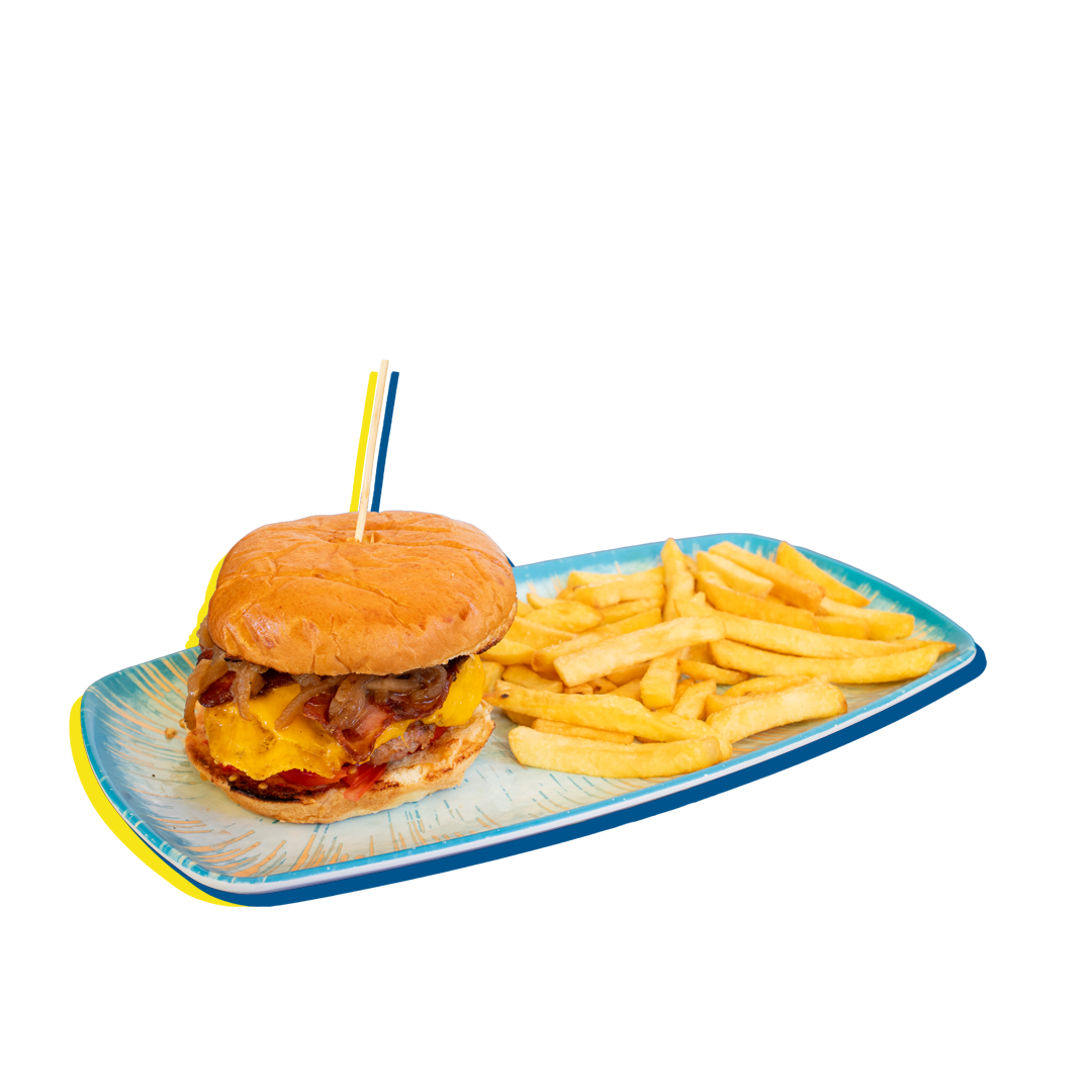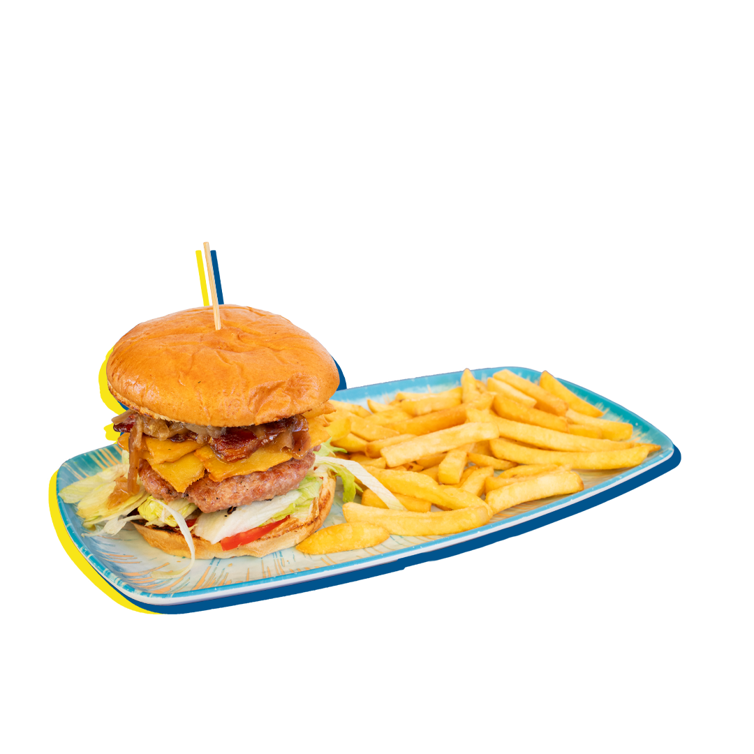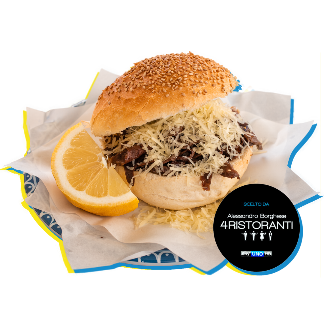 Bun Artigianale, Hamburger da 150g, lattuga, cipolla cotta, bacon, pomodoro