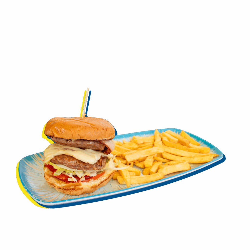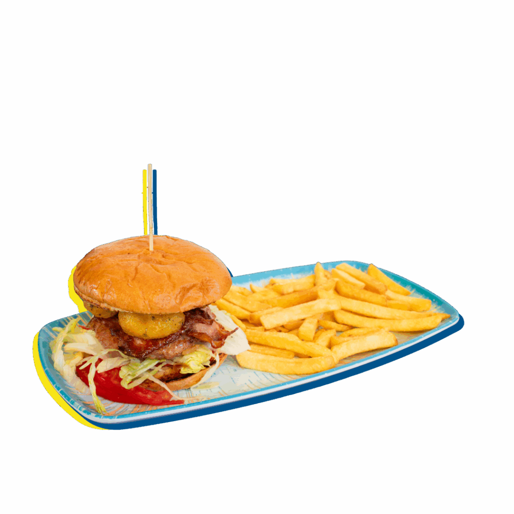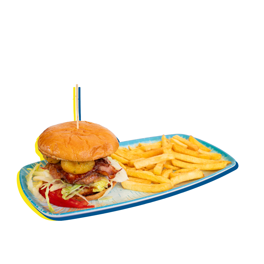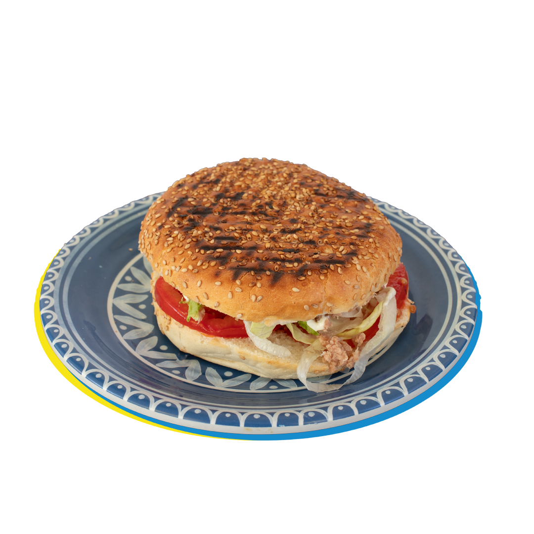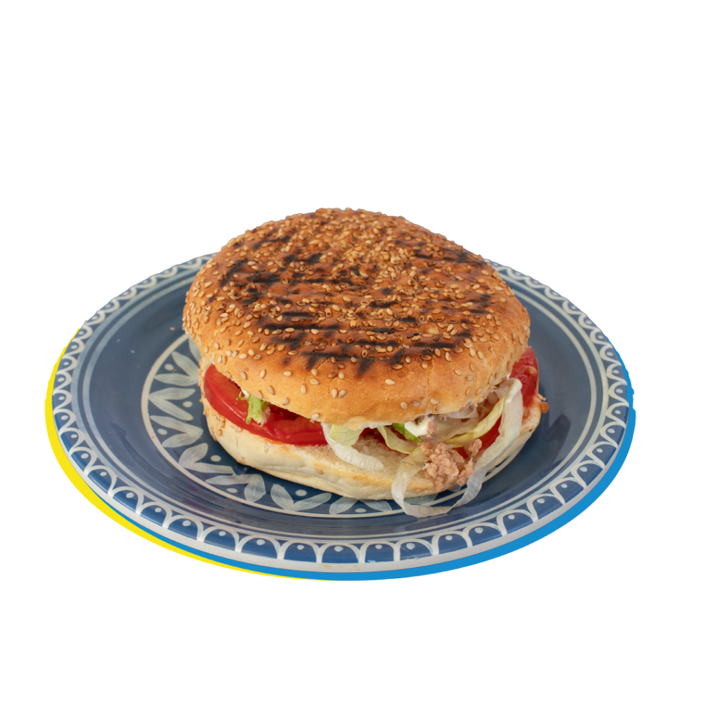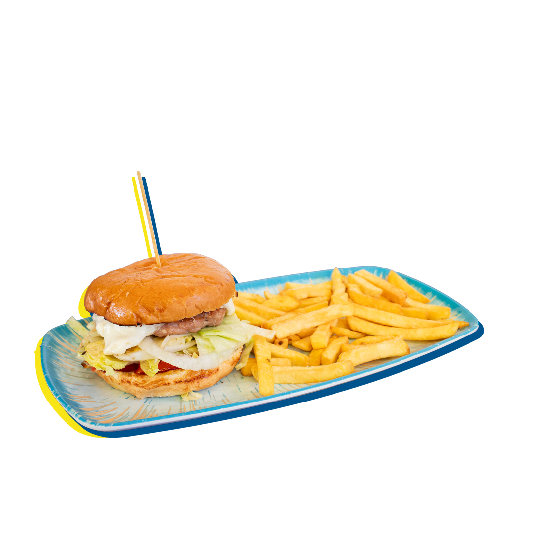 Bun Artigianale, Hamburger da 150g, lattuga, cipolla cotta, bacon, pomodoro