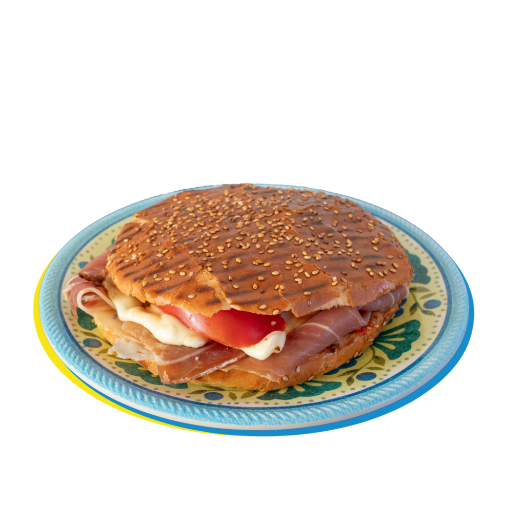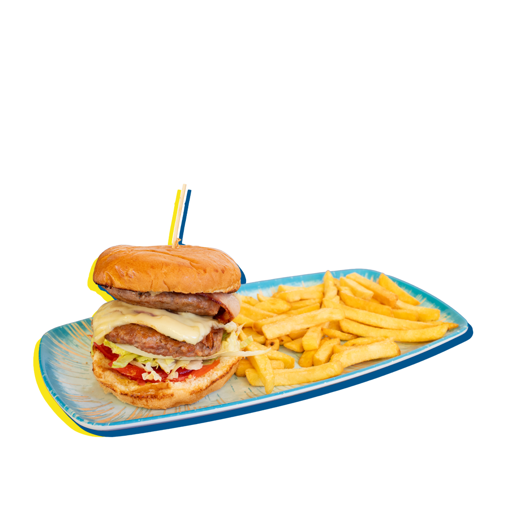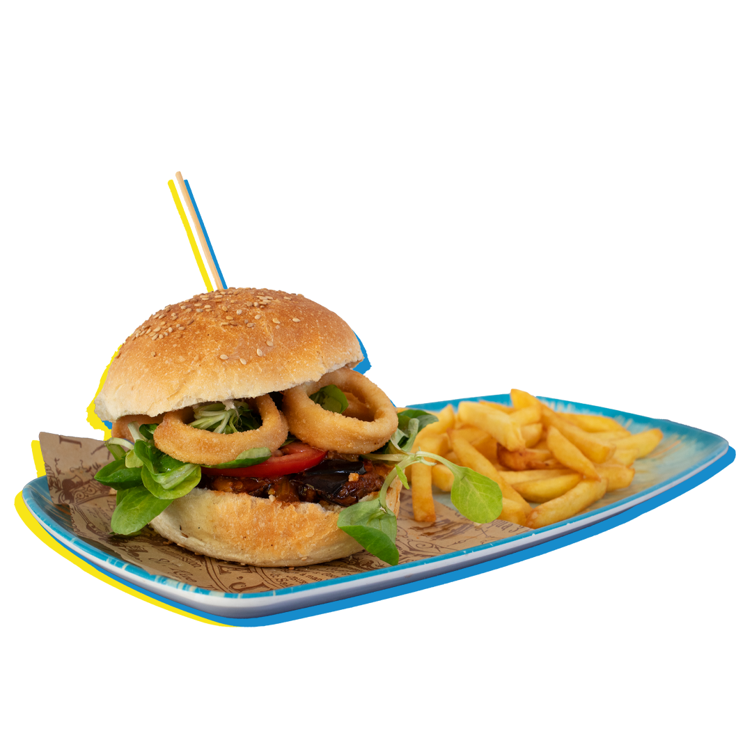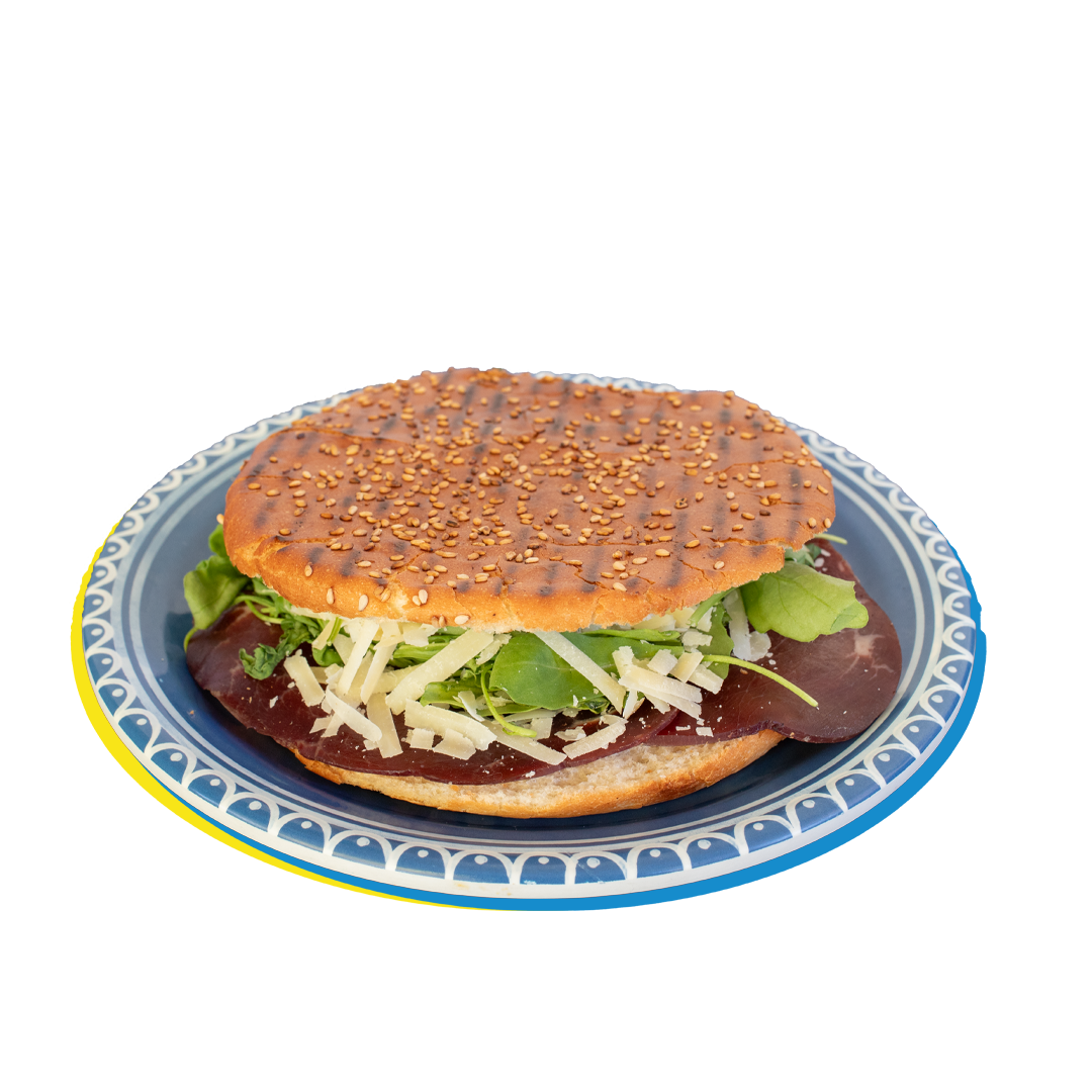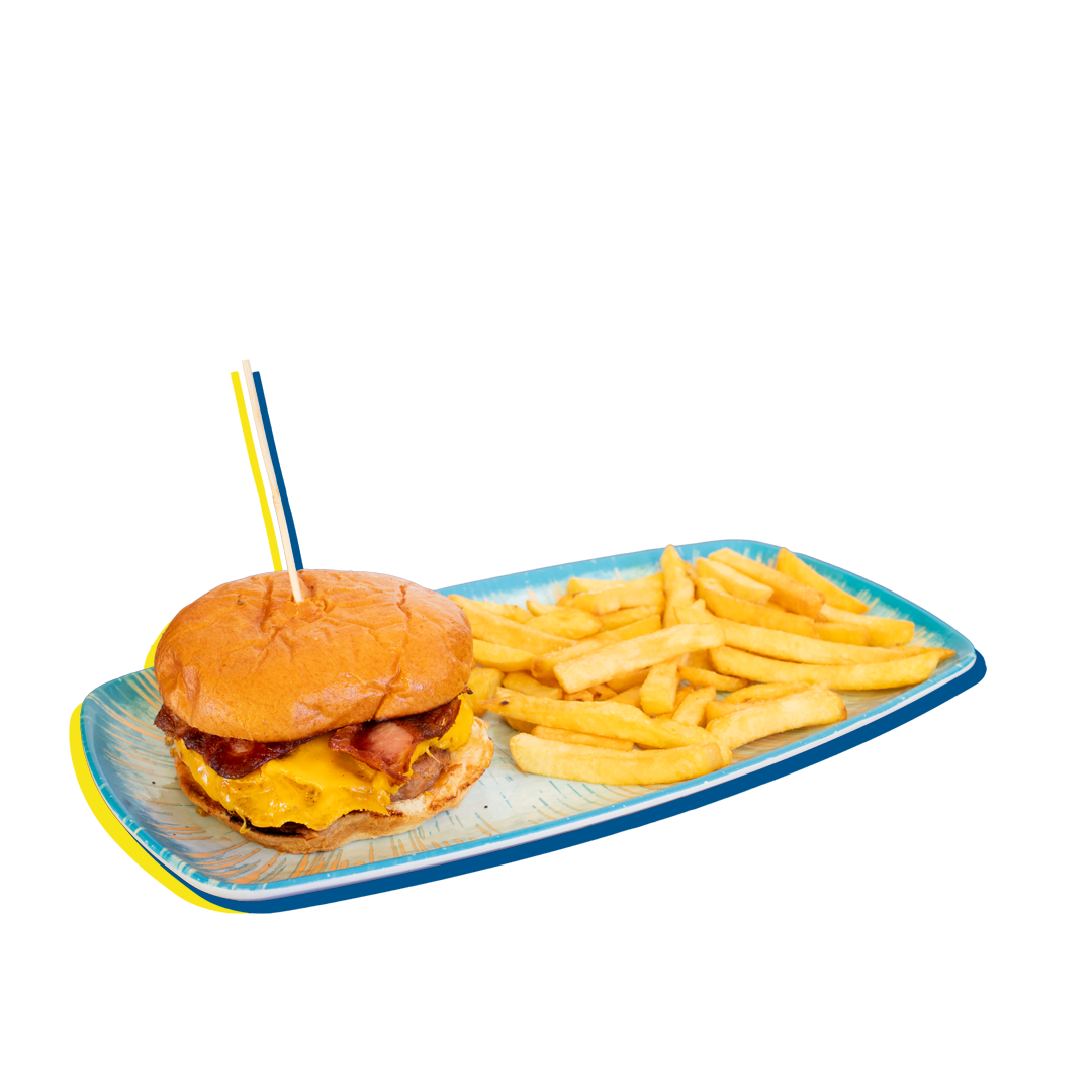 Bun Artigianale, Hamburger da 150g, lattuga, cipolla cotta, bacon, pomodoro