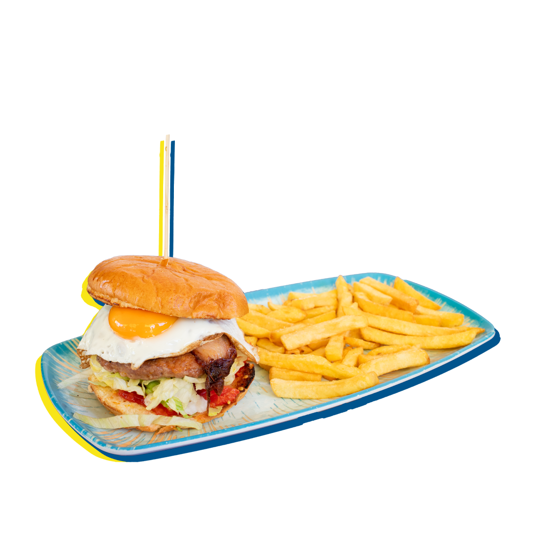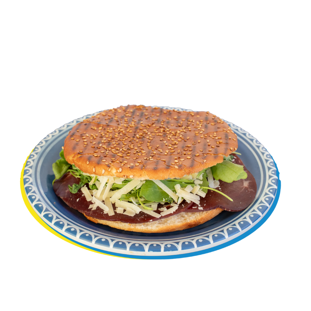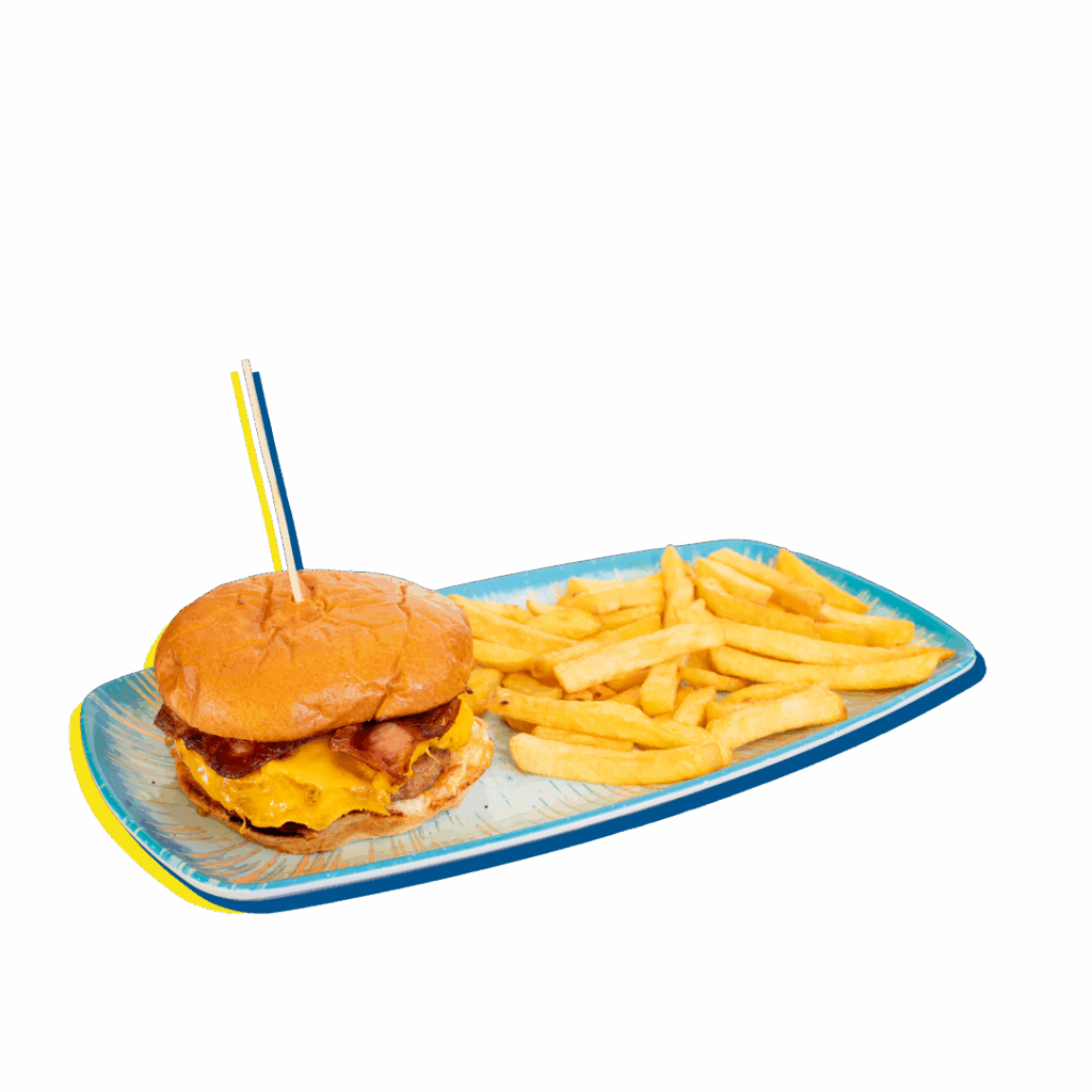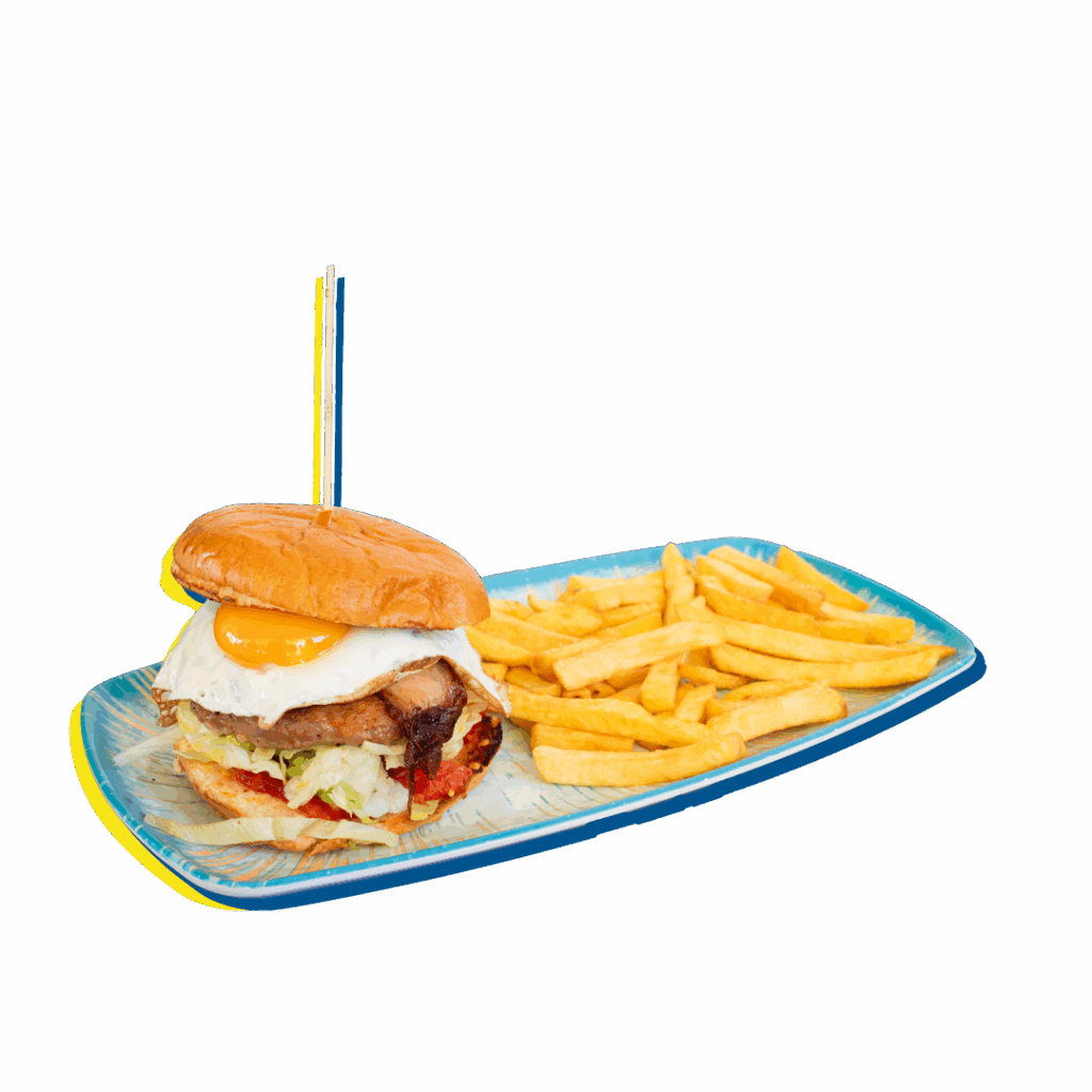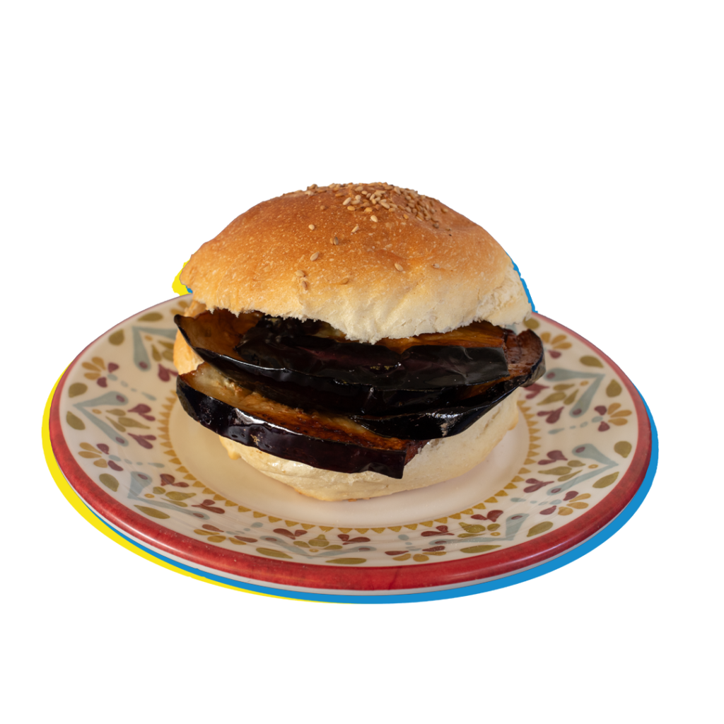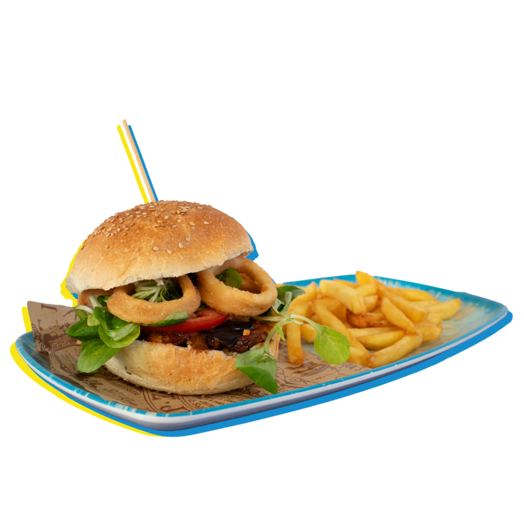 Bun Artigianale, Hamburger da 150g, lattuga, cipolla cotta, bacon, pomodoro