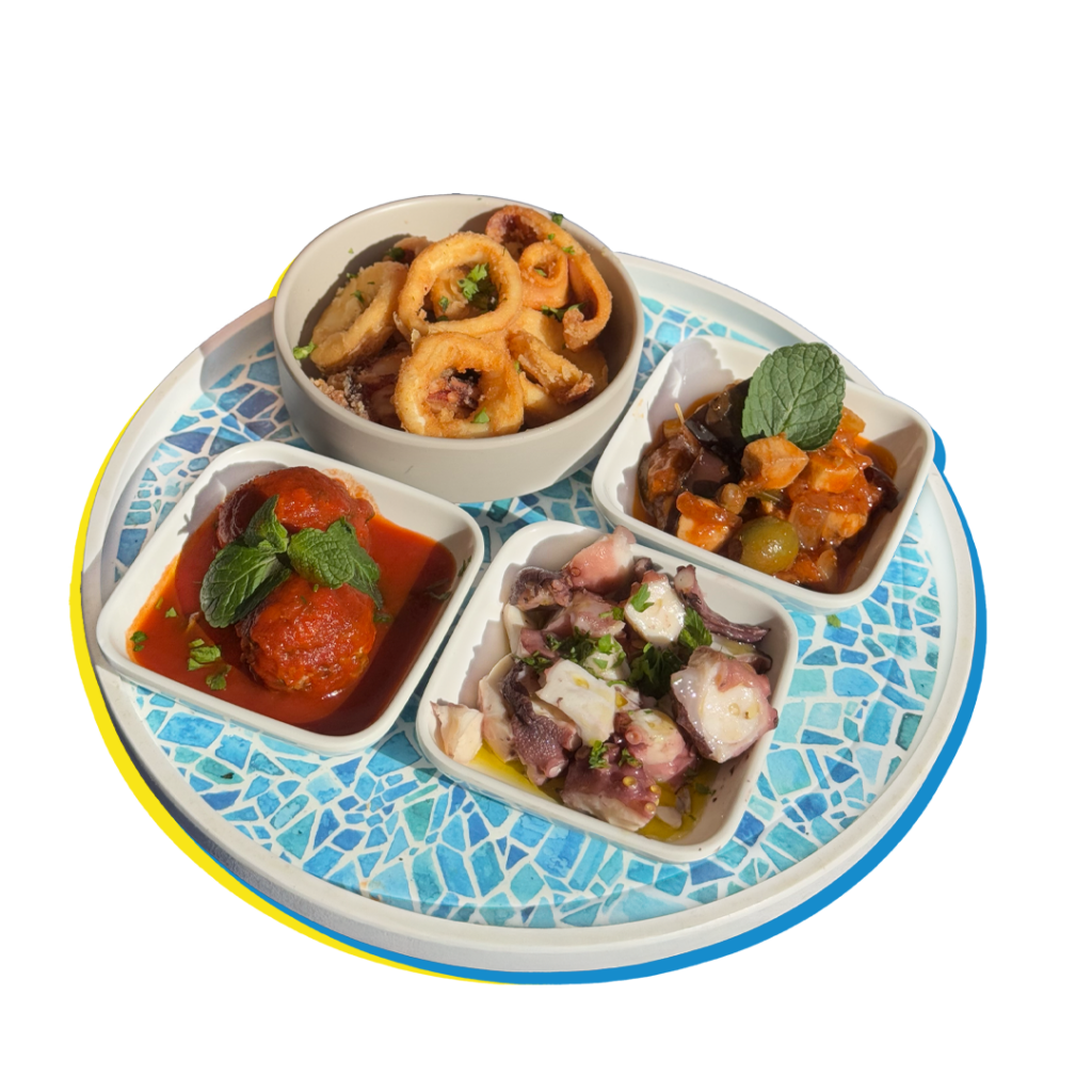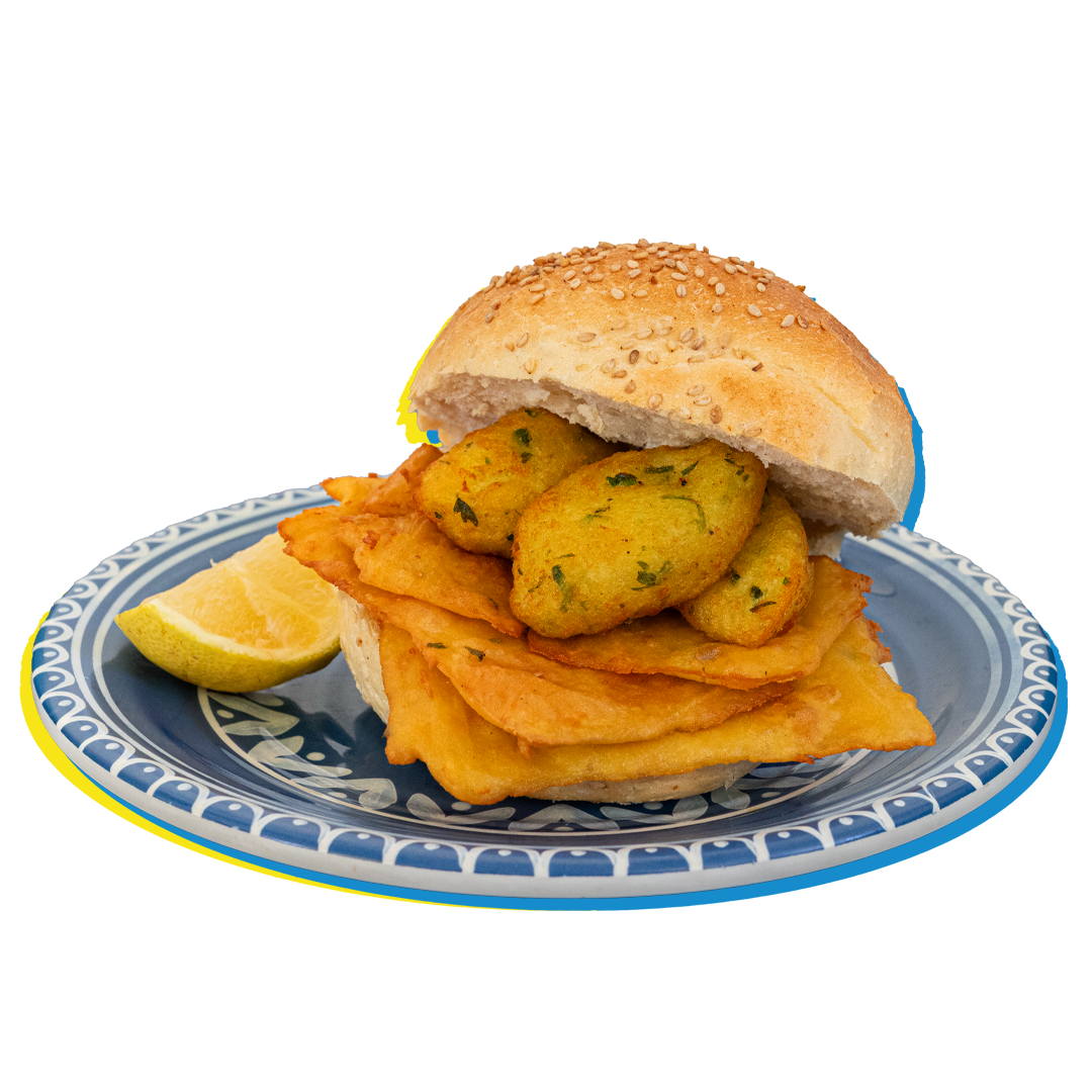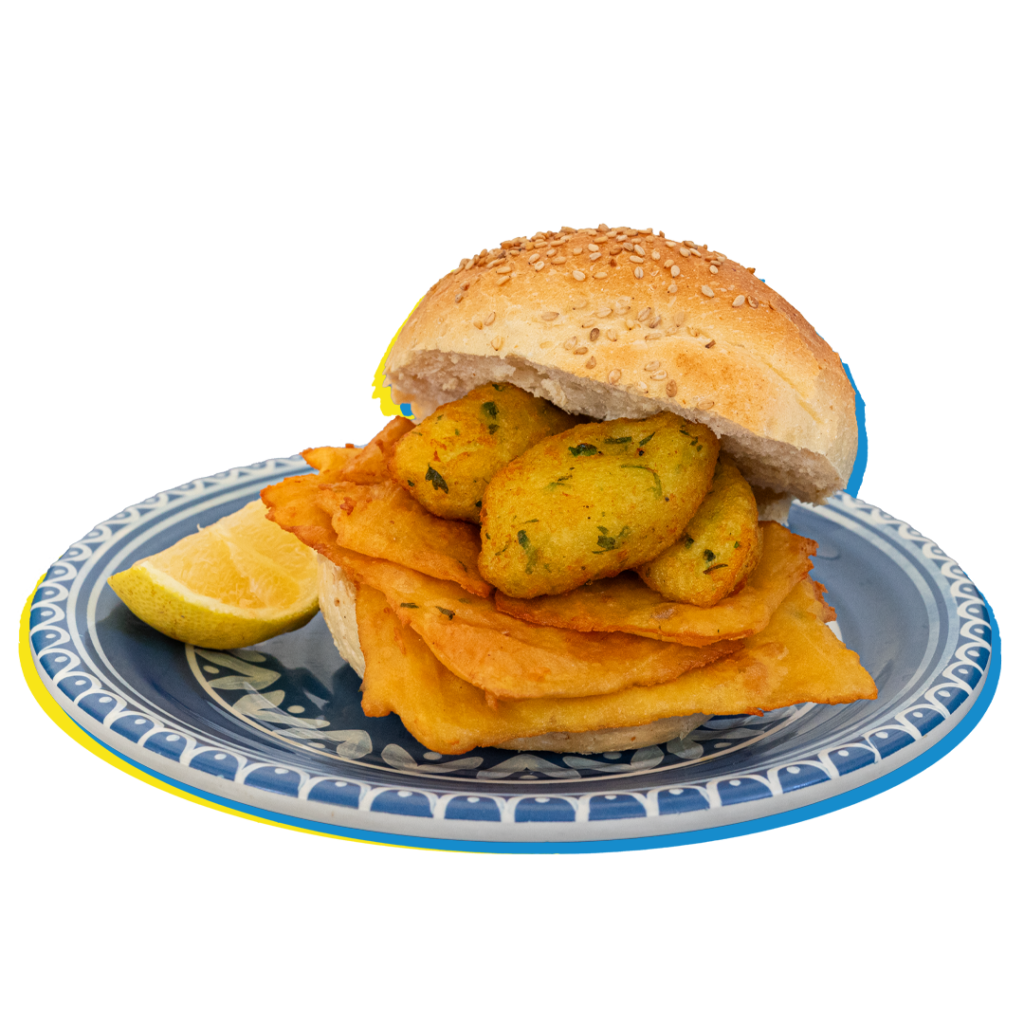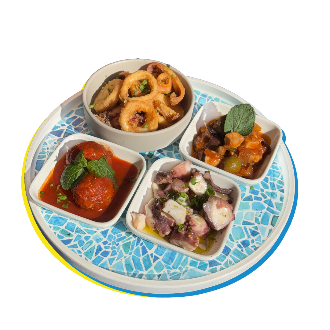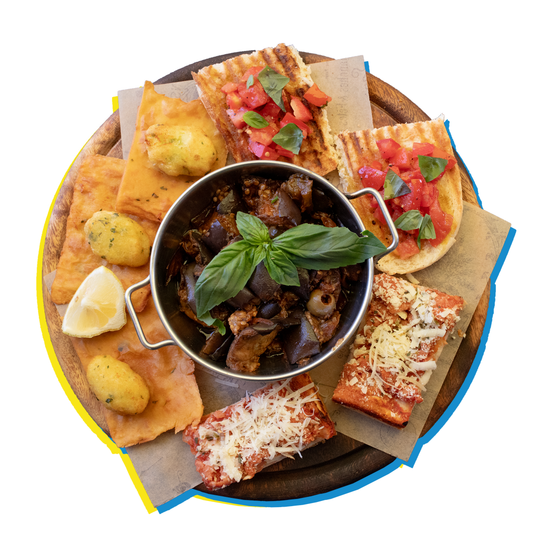 Panelle e crocché, bruschette al pomodoro, sfincione, caponata di melanzane.
